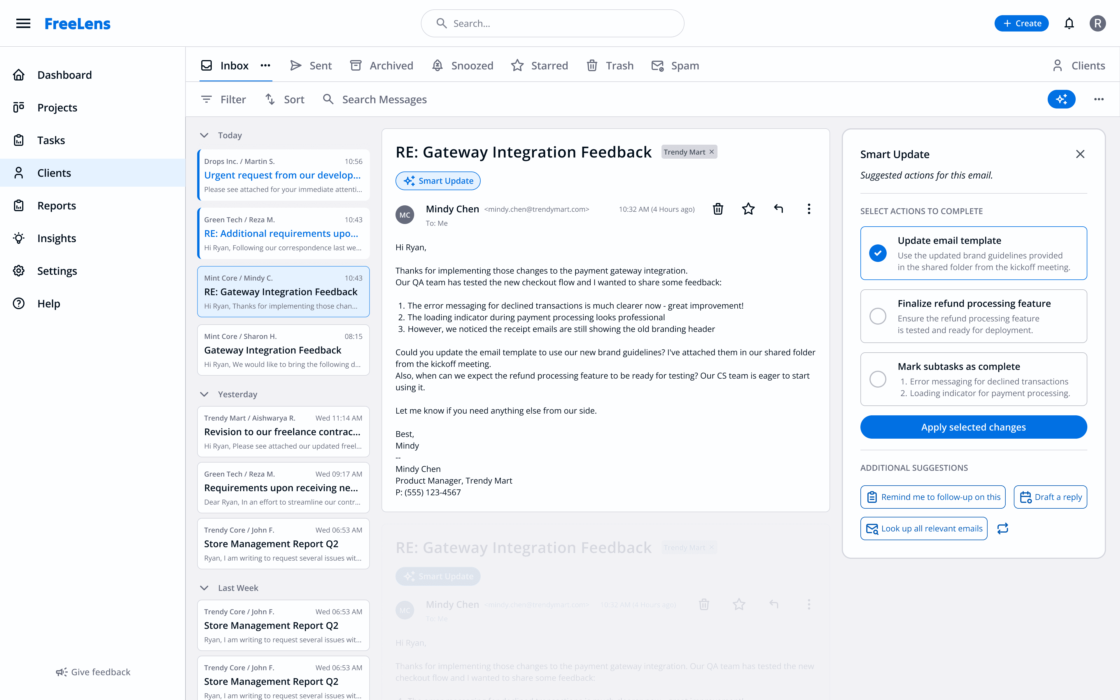 This screen streamlines client communication by integrating emails and messages into the project management system. The 'Smart Update' feature automatically detects task updates or client requests and suggests corresponding actions, such as marking tasks as complete or updating progress. This ensures users stay on top of client needs without manual tracking, saving time and reducing the risk of missed details. Additional suggestions, like reminders and related emails, further enhance task management efficiency