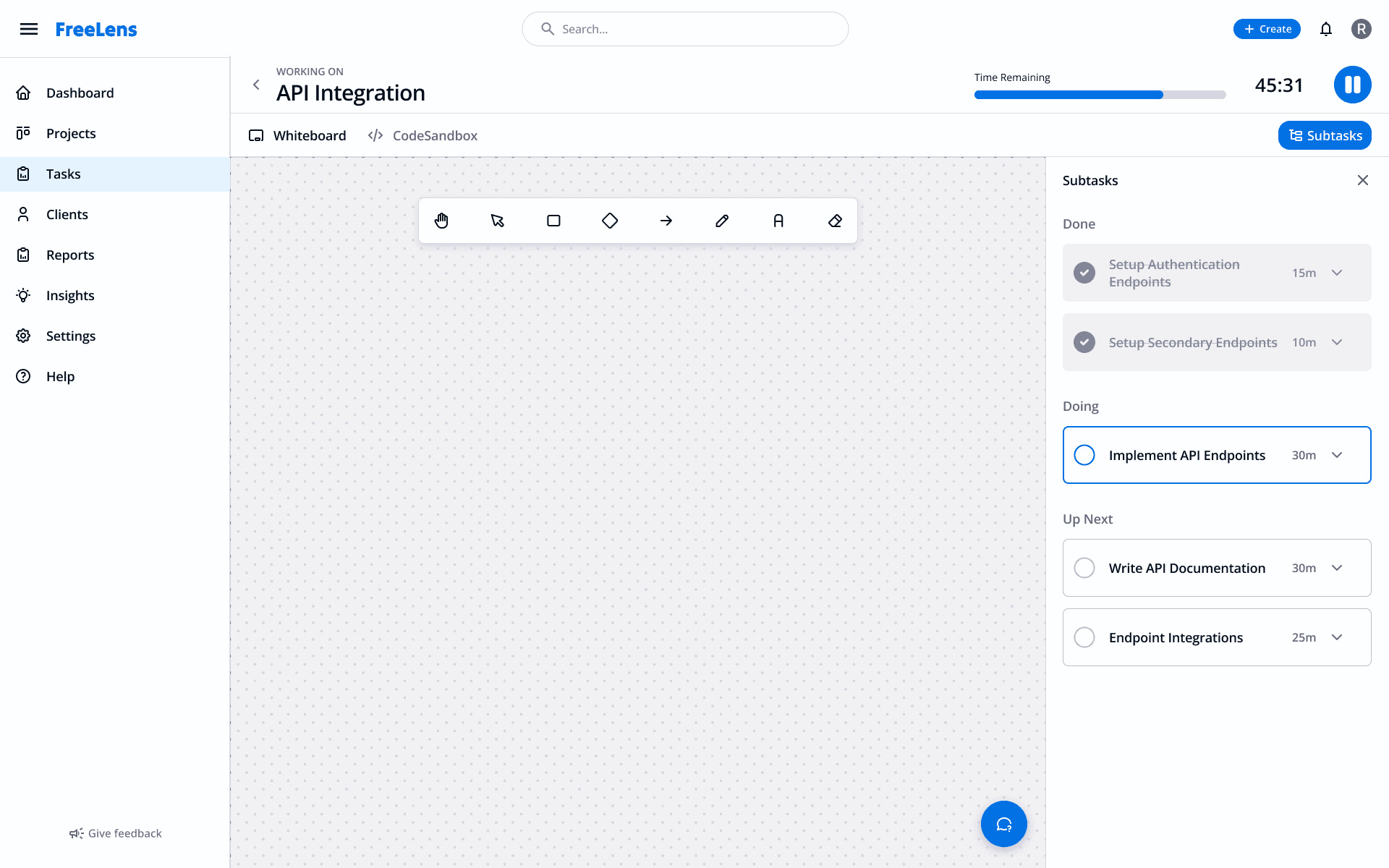 Helps freelancers focus by showing task details, a built-in timer to track progress, and tool integration (e.g., Whiteboard). It adapts to diverse workflows while improving time tracking for smarter billing and task predictions.