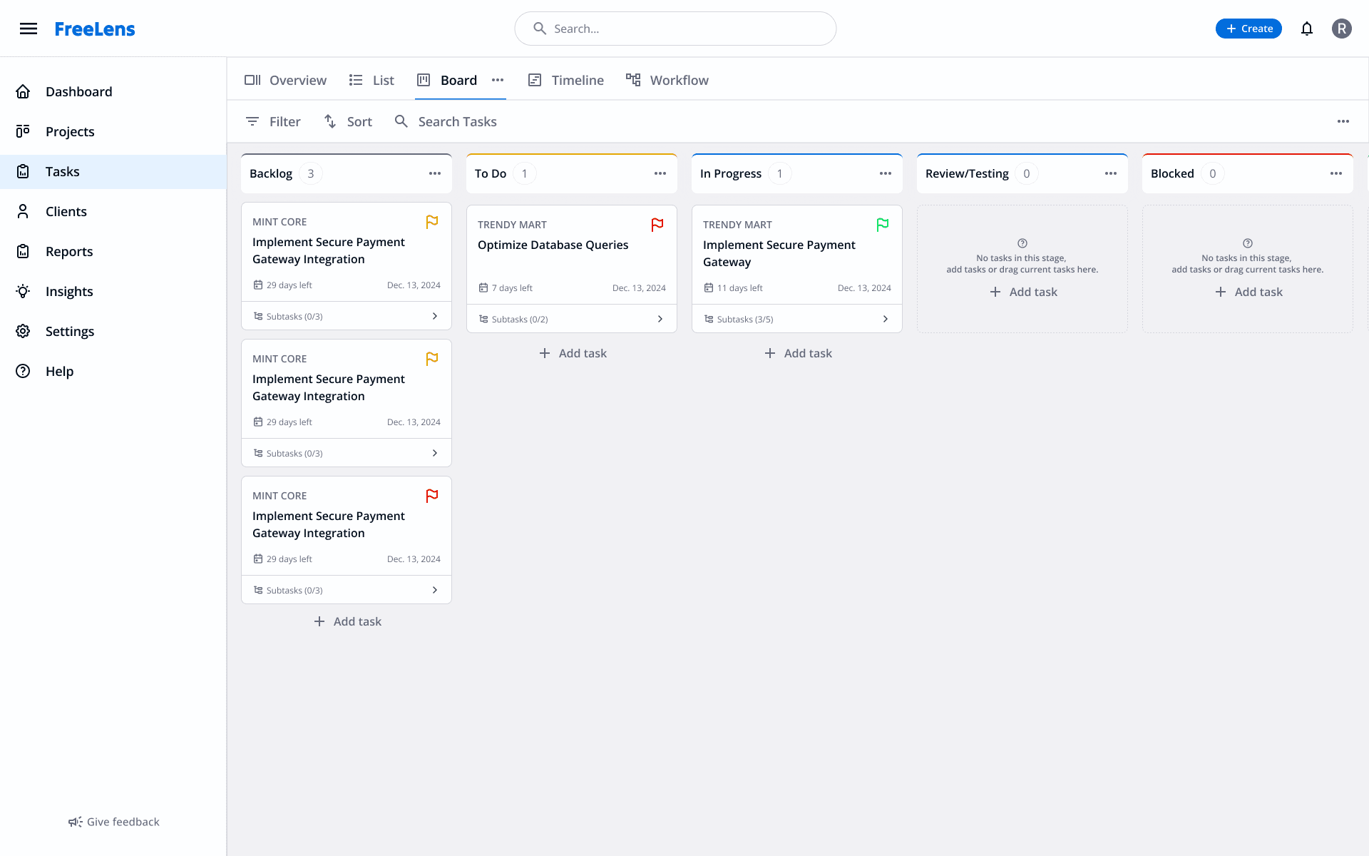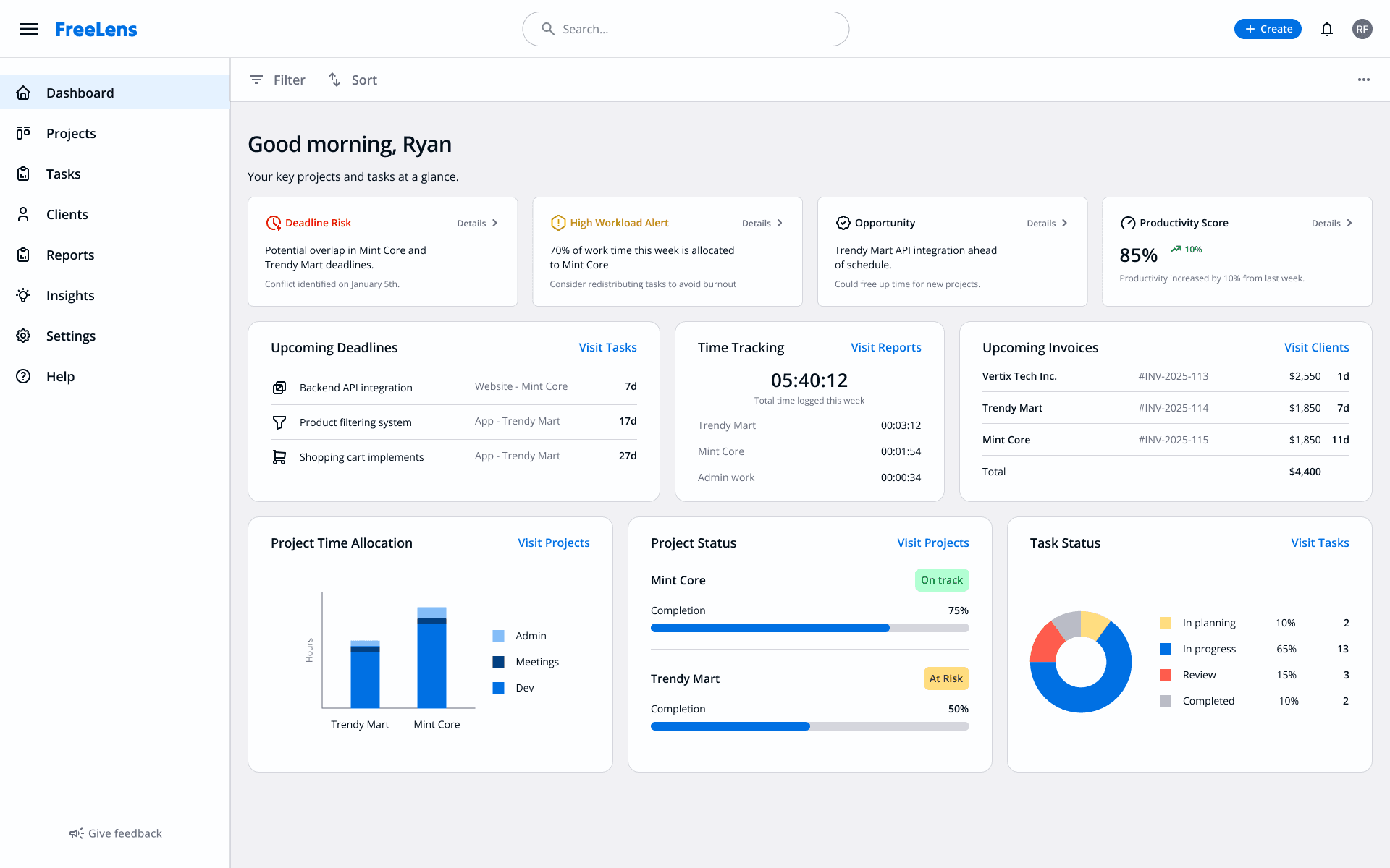 Provides an overview of key tasks, upcoming deadlines, and project statuses at a glance, helping freelancers stay organized and prioritize effectively.